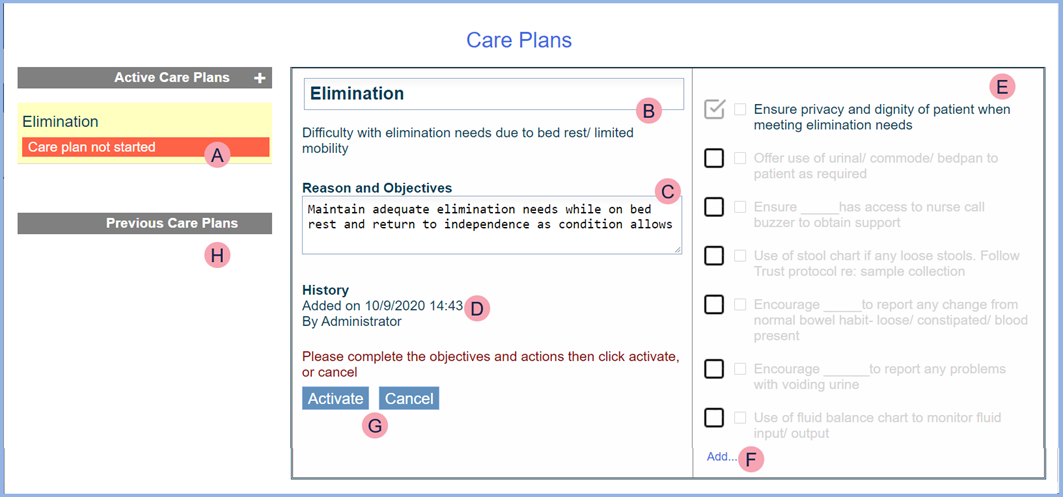 Previous Care Plans displays a list of past, inactive care plans, You can reactivate a previous care plan. |