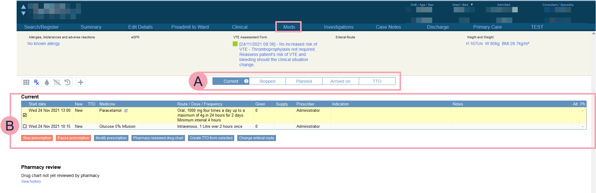 Current Medications includes arrival medications, TTO progress indicators, medications, and an overview of current medications. You can’t administer medications from here.