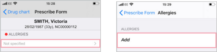 Allergies added before the current admission are stored in Nervecentre. They need to be confirmed as correct at each new admission.