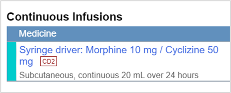 The list is split into sections: Stat and Once Only, Regular, PRN, Continuous Infusions, Fluids, and Stopped. Fluids, continuous infusions, and Stat and once only prescriptions remain on the chart for 48 hours after administration. Then they are then moved to Stopped. |