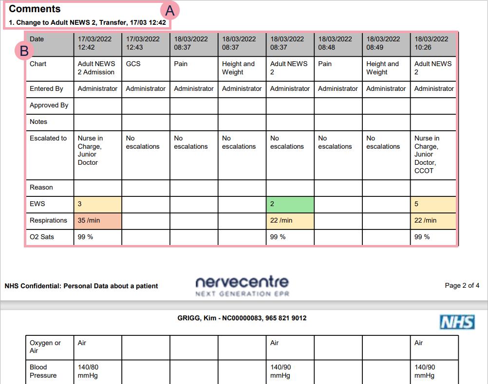 Every subsequent page header contains the patient's full name, hospital number, and NHS number where applicable. In future releases, this might be expanded to show the patient's date of birth and current location.