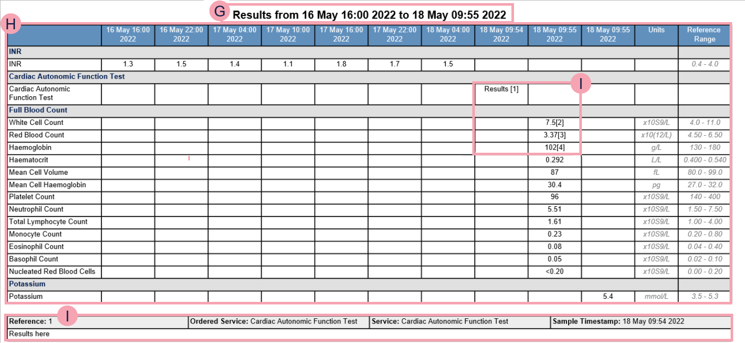 If results have an associated note, [n] appears next to the result, where n is a number. Below the table of results, is a list of notes. Each note has a number that matches a number in the table of results. |