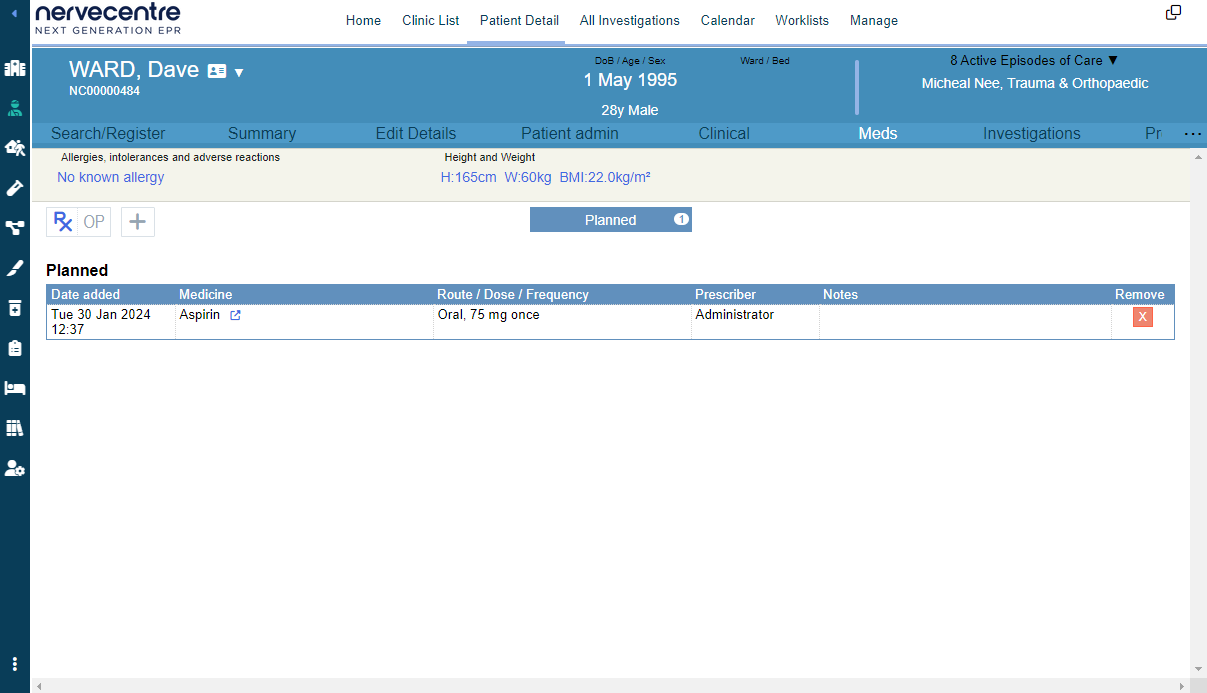 When you add planned medications for an inpatient visit, Nervecentre automatically presents you with prescriptions for inpatients.