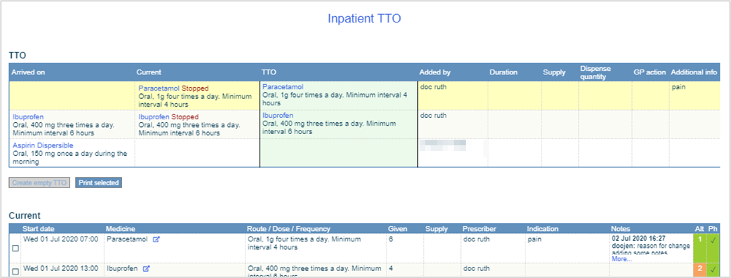 The patient's TTO list appears with information useful for dispensing TTO medications.