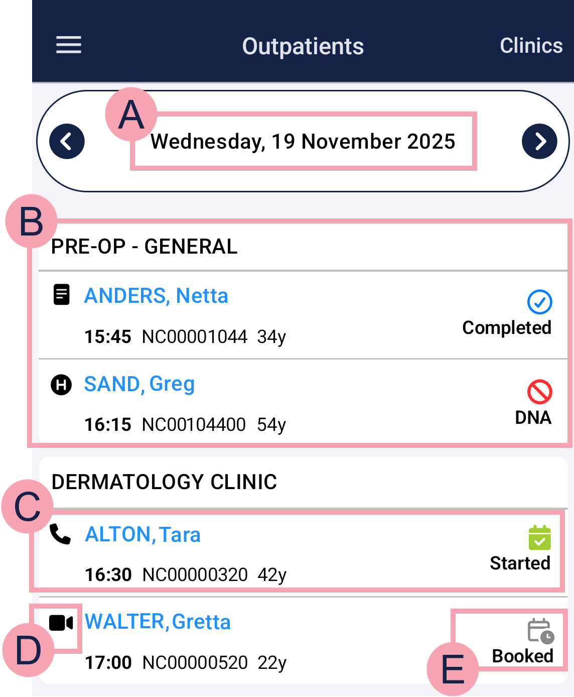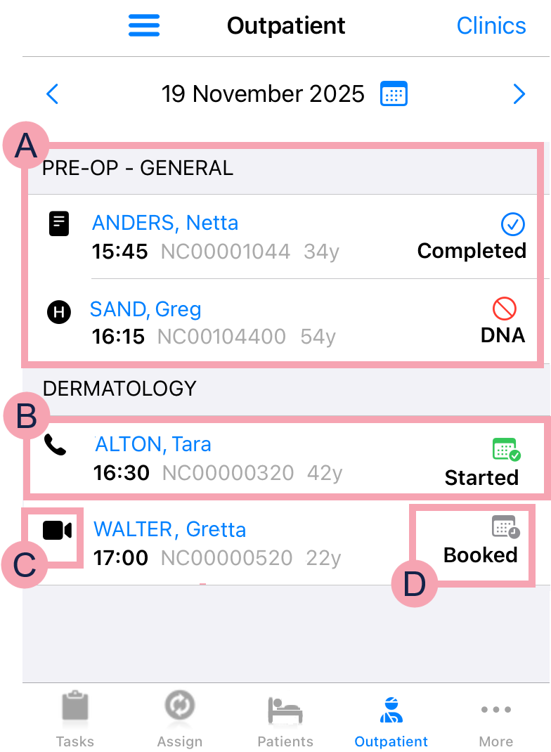 You can view a list of all patients with an appointment at a clinic on a specific day. On a desktop, you can view this list from Outpatients > Clinic List. On a mobile, you can view this list from Outpatient on iOS, and Outpatients on Android.