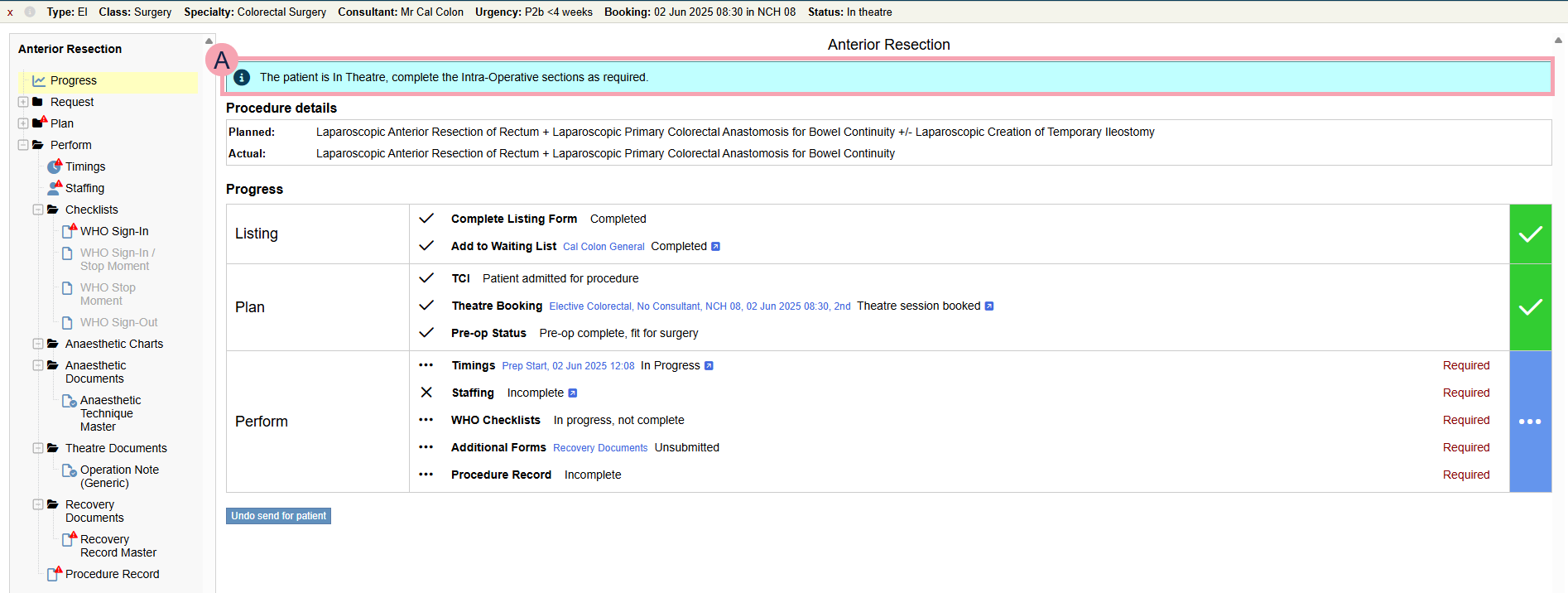 You can view what you need to do next for a procedure from Patient Detail > Procedures > Progress. For example, if you need to add the patient to a waiting list, update the pre-op status, or complete the procedure record.