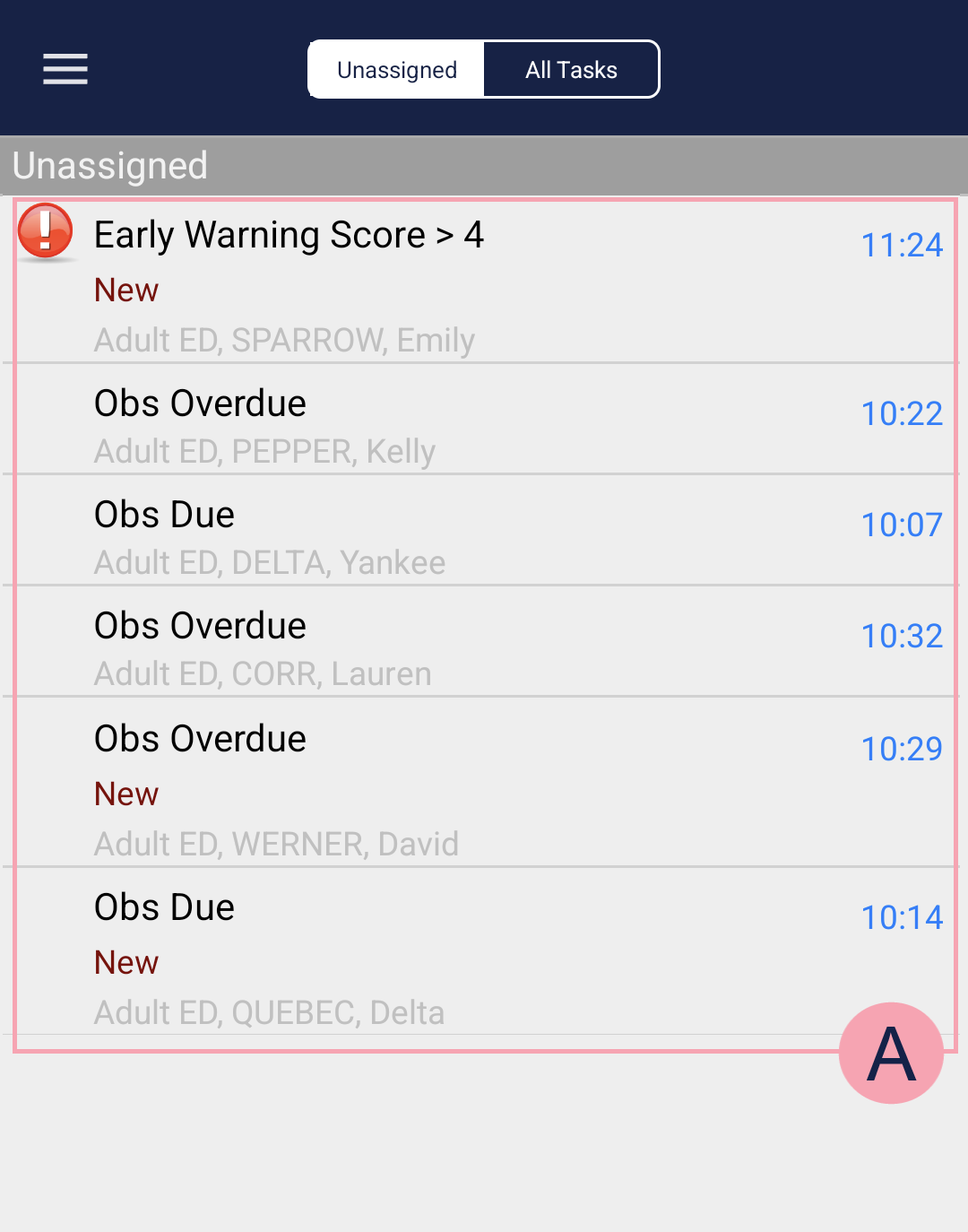 A list of tasks. Shows the task's priority and name, the patient's location and name, and the time the task was created. Select and hold any task to sort the list of tasks. You can sort tasks by priority, location, age, or category.