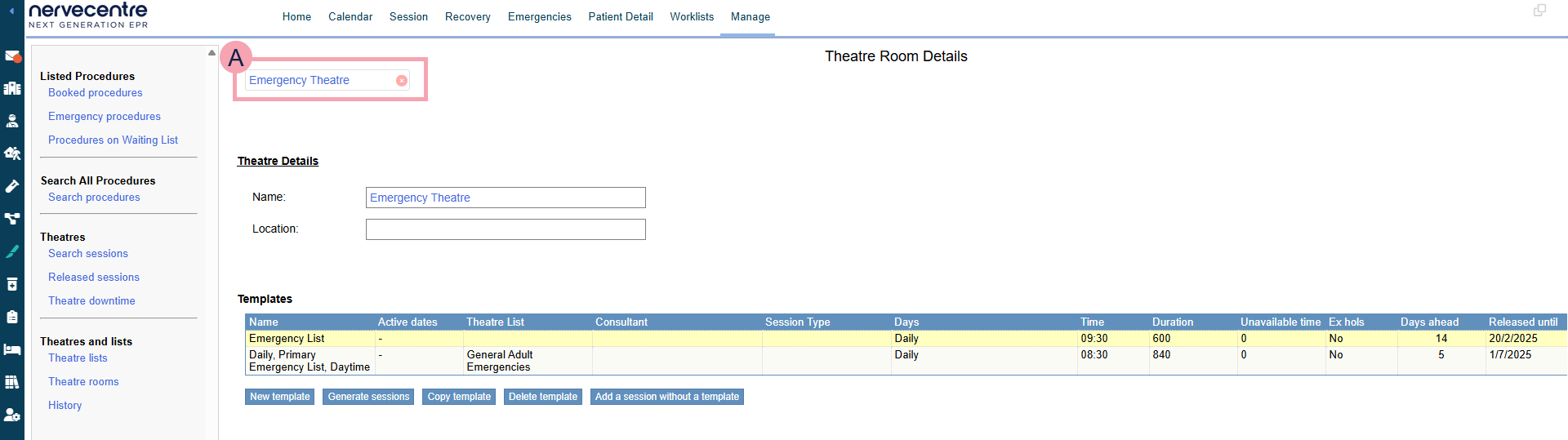 Select a theatre list to create sessions for that theatre list.