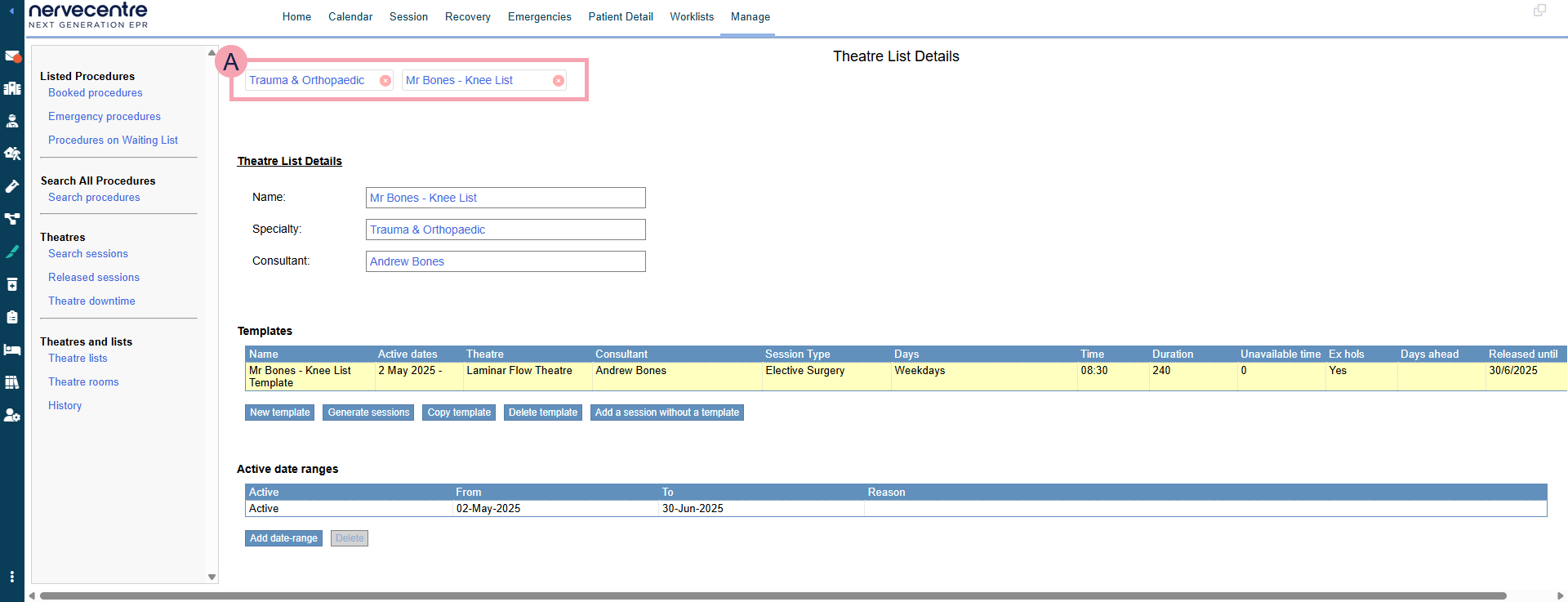 Templates allow you to create recurring sessions for a theatre list. Templates define the theatre list, theatre, start time, and duration of sessions.