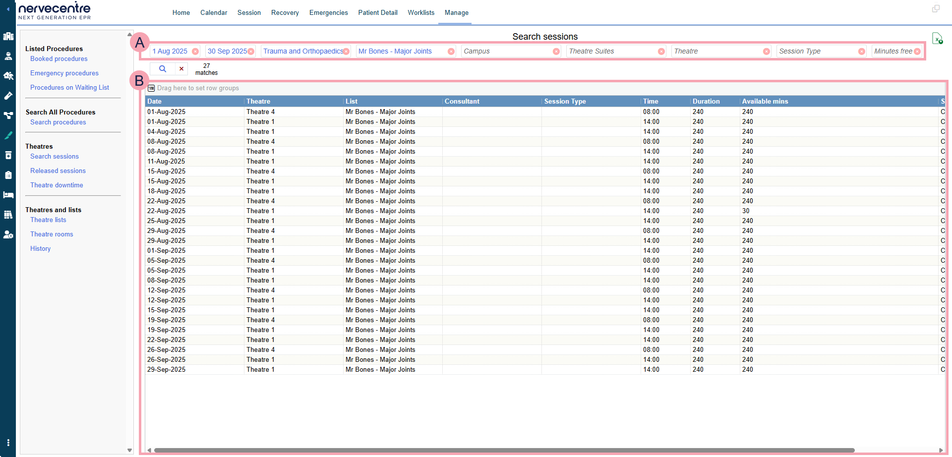 From Theatres > Manage > Search sessions, you can search all sessions.