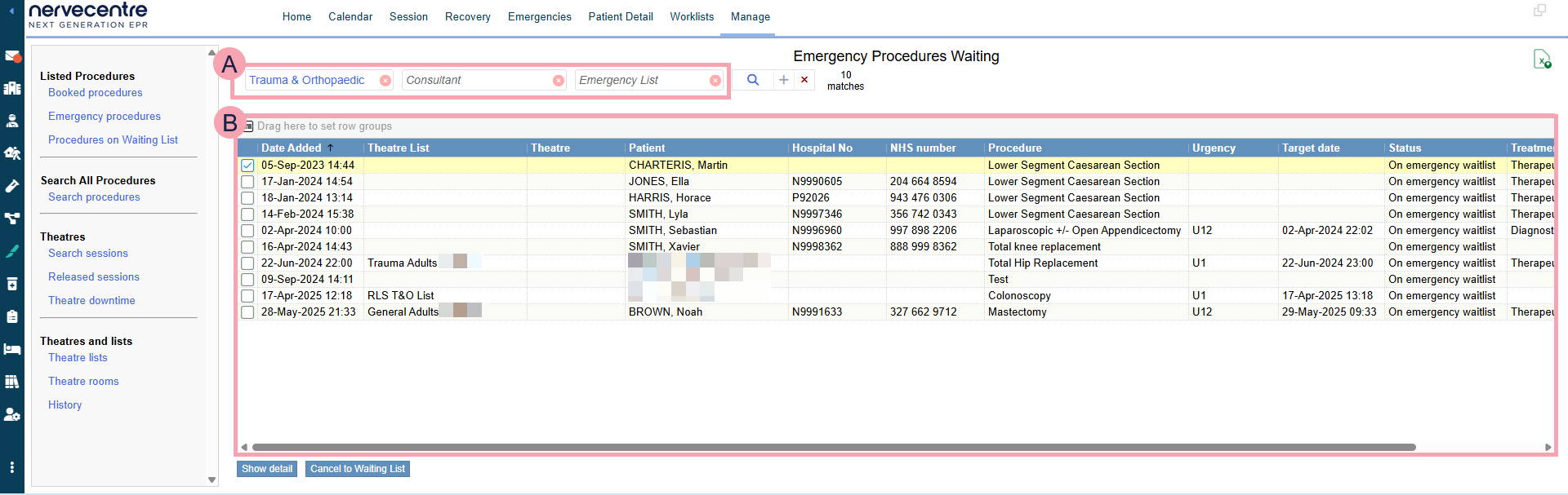 From Theatres > Manage > Emergency procedures, select your search criteria.