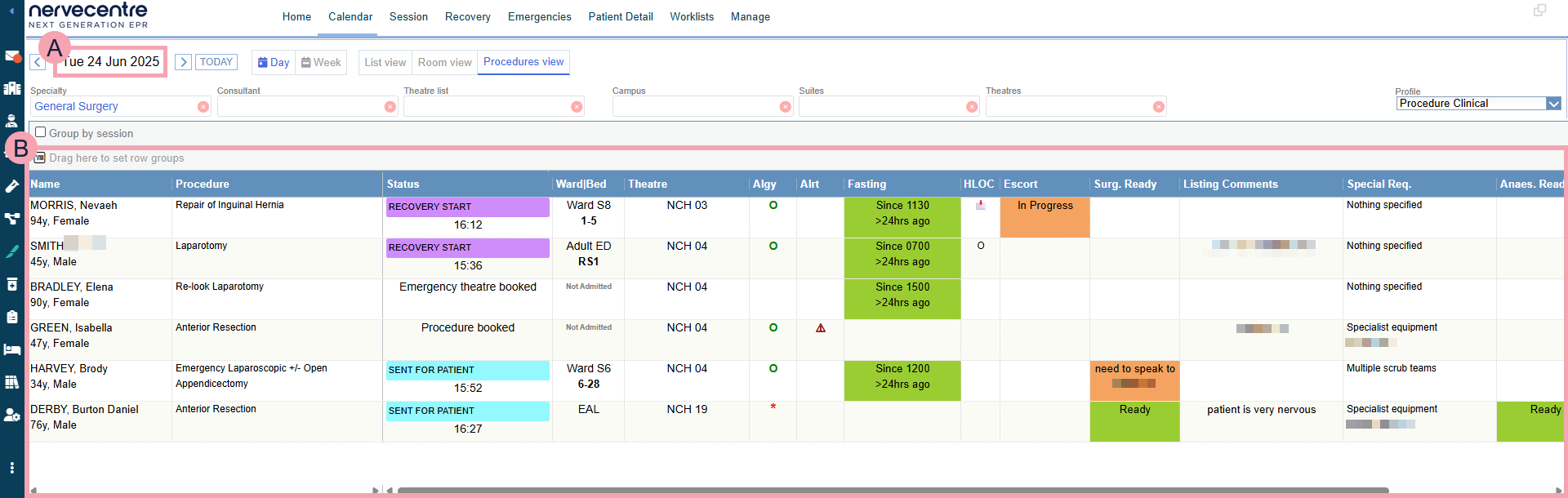 From Theatres > Calendar > Procedures view, you can view a list of procedures booked with a specified time frame.