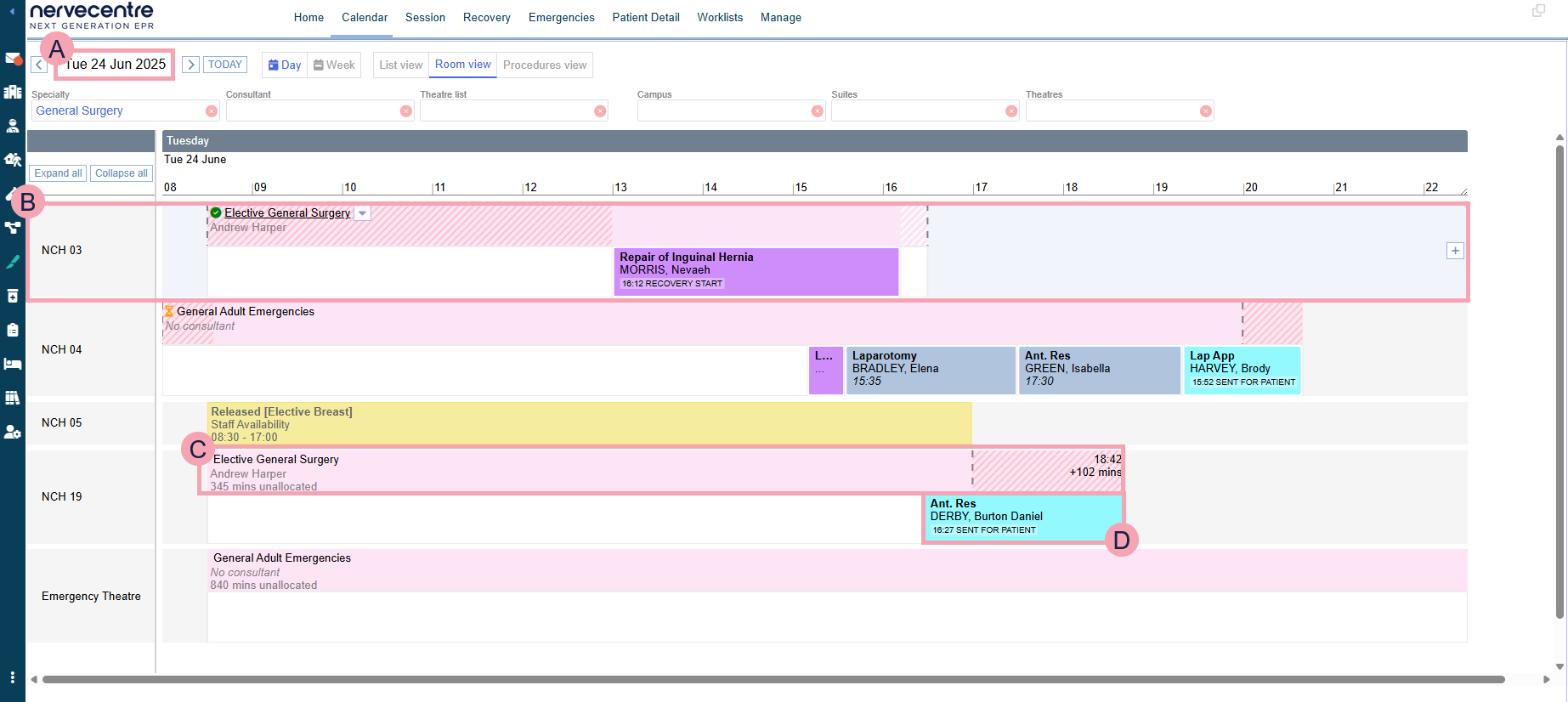You can view theatre sessions from Theatres > Calendar. You can view a specific day, or a specific week. There are three different layouts for your calendar: List view, Room view, and Procedures view.